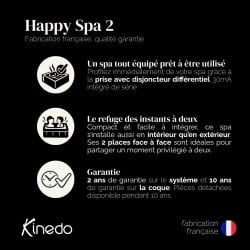 Pensé pour les amoureux du confort et du bien-être, le SPA Happy 2 de Kinedo incarne l’excellence du savoir-faire français en matière de relaxation. Fabriqué en France avec des matériaux haut de gamme, ce spa compact est conçu pour s’intégrer aussi bien en intérieur qu’en extérieur, tout en offrant une expérience de massage complète et enveloppante.